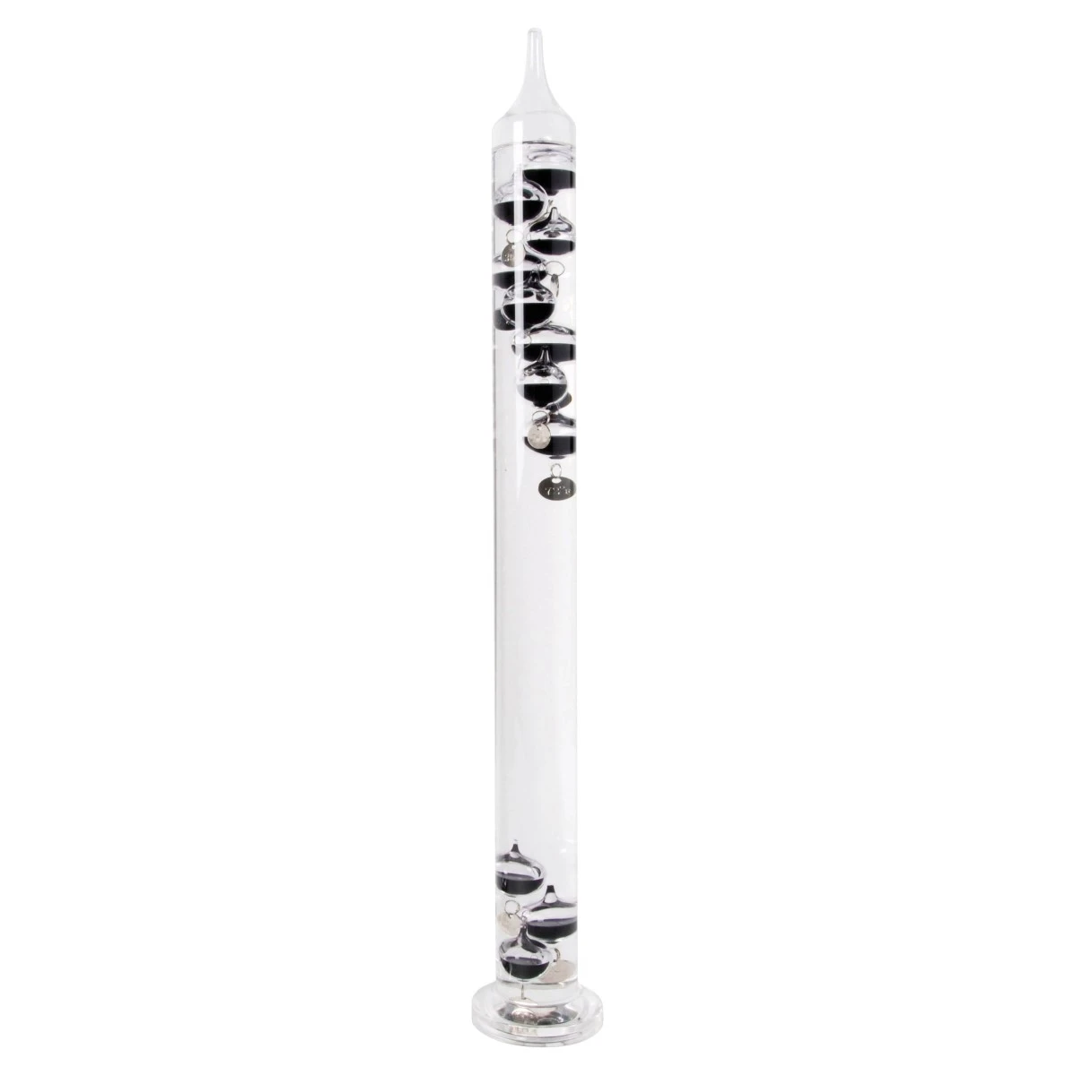 Zoekend naar een manier om exact temperaturen te meten, ontdekte Galileo deze fascinerende methode. Hij plaatste meerdere exact uitgemeten ballen in een cylinder gevuld met een bepaalde vloeistof. Hij ontdekte dat de ballen stegen of daalden afhankelijk van de aanwezige temperatuur. Met deze methode, was hij in staat om de exacte temperatuur vast te stellen. Wanneer de temperatuur stijgt wordt de vloeistof in de glazen cylinder minder dicht en zinken de zwaardere ballen langzaam naar de bodem. Deze glazen thermometer kan dankzij de voet stabiel op elke plek geplaatst worden. De schaal van de thermometer wordt in Celsius als in Fahrenheit weergegeven dankzij een metalen plaatje onder iedere glazenbolletje.