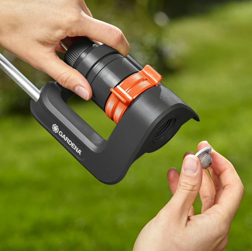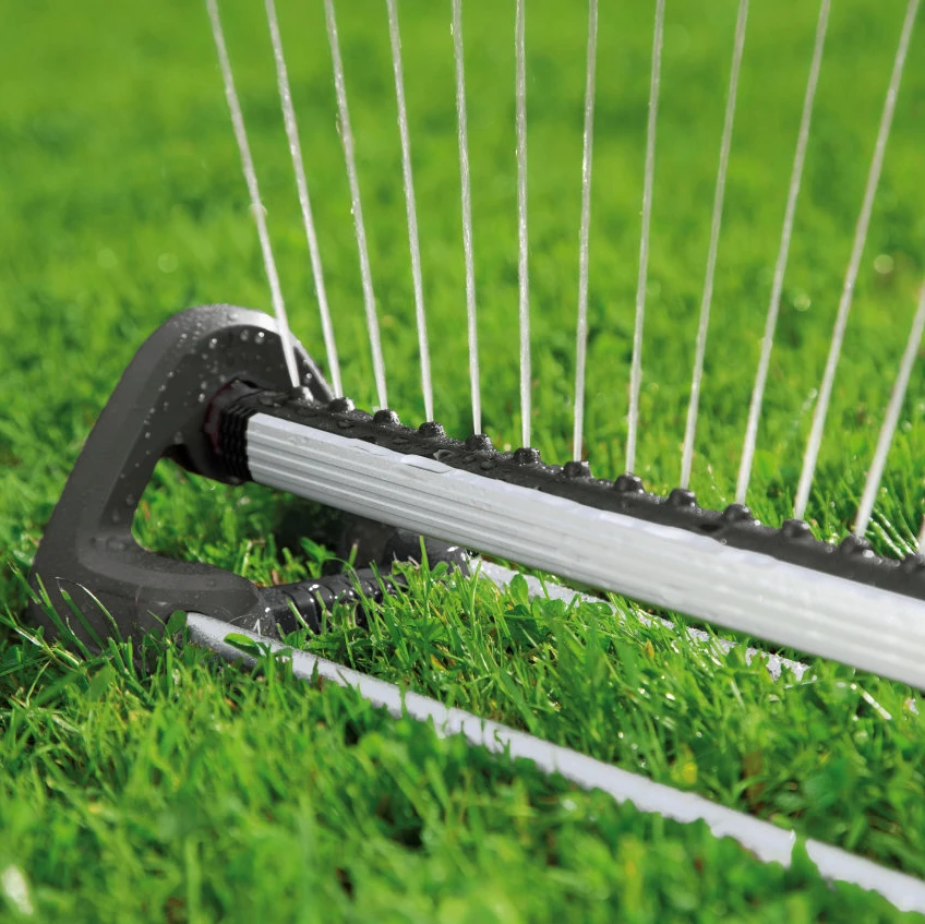 Met de Aqua M zwenksproeier van GARDENA bepaalt u wanneer uw gazon wordt bewaterd. U kunt erop vertrouwen dat het iedere keer weer betrouwbaar en vooral ook heel gelijkmatig, zonder plasvorming gebeurd. Geniet van elk moment van de zomer. De sproeier is ontworpen voor oppervlakken van 110 tot 250 m²,en heel eenvoudig en snel in gebruik te nemen. Nadat u de slang hebt aangesloten, kunt u met de schuifregelaar het bereik instellen tussen 8 en 18 meter. De breedte van de waterstralen blijft altijd maximaal 14 meter. U heeft de optie om slechts één kant van het gazon water te geven. Het gebruik van metaal zorgt ervoor dat de sproeier licht van gewicht is, maar wel stevig op het gazon staat. De GARDENA zwenksproeier Aqua M is gemaakt van hoogwaardige materialen en voorzien van het “Made in Germany”-zegel, wat vooral blijkt uit twee opmerkelijke details: ten eerste, de sproeier is beschermd tegen UV-straling en vorstbestendig. Bovendien heeft de sproeier een fabrieksgarantie van 5 jaar. Een metalen filter bevindt zich op de wateraansluiting zodat vuildeeltjes niet in de sproeier kunnen komen. Het filter is uitneembaar door de verbinding te draaien en vervolgens eenvoudig onder de waterstraal af te spoelen. Aan het andere uiteinde is een reinigingsnaald in de schroefdop geplaatst, die u kunt gebruiken om de sproeimondjes van de sproeier eenvoudig te ontdoen van eventuele kalkaanslag.