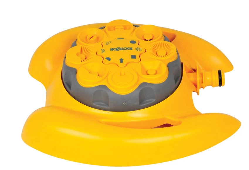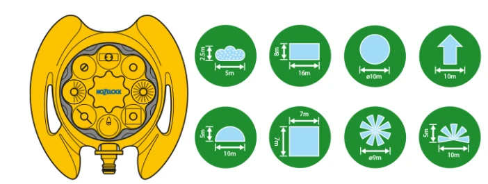 Een zeer flexibele sproeier met 8 sproeipatronen namelijk: kleine halve cirkel, grote halve cirkel, nevel, langwerpig, grote cirkel, kleine cirkel, vierkant en harde straal. Deze watersproeier is makkelijk in te stellen en wanneer die werkt is deze nog van stand te veranderen zonder nat te worden. Het maximumbereik van deze multi-sproeier is 79m2 (Maximum diameter is 10 meter).
