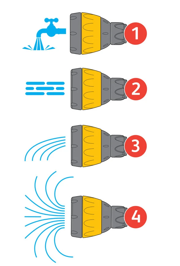 - Pistool met drie sproeipatronen: broes, snelvullen en jet.